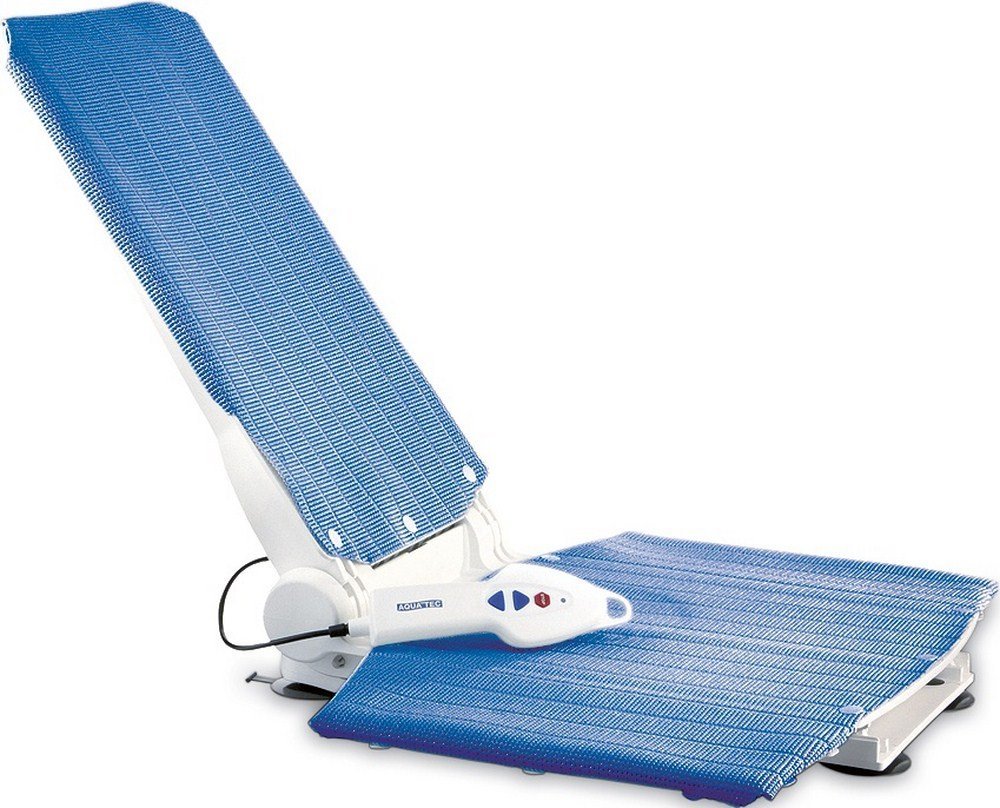 "specifications": "<table cellspacing=\"7\" cellpadding=\"0\">\n<tbody>\n<tr>\n<td class=\"sml-bold-arial-black\" valign=\"top\" width=\"40%\">Recline Angle:</td>\n<td class=\"med-arial\" valign=\"top\" width=\"65%\">10 to 40 degrees</td>\n</tr>\n<tr>\n<td class=\"sml-bold-arial-black\" valign=\"top\" width=\"40%\">Seat Depth:</td>\n<td class=\"med-arial\" valign=\"top\" width=\"65%\">19\"</td>\n</tr>\n<tr>\n<td class=\"sml-bold-arial-black\" valign=\"top\" width=\"40%\">Seat Width:</td>\n<td class=\"med-arial\" valign=\"top\" width=\"65%\">15\", 28\" with flaps down</td>\n</tr>\n<tr>\n<td class=\"sml-bold-arial-black\" valign=\"top\" width=\"40%\">Overall Length:</td>\n<td class=\"med-arial\" valign=\"top\" width=\"65%\">24\", 33\" reclined</td>\n</tr>\n<tr>\n<td class=\"sml-bold-arial-black\" valign=\"top\" width=\"40%\">Back Height:</td>\n<td class=\"med-arial\" valign=\"top\" width=\"65%\">26\"</td>\n</tr>\n<tr>\n<td class=\"sml-bold-arial-black\" valign=\"top\" width=\"40%\">Back Width:</td>\n<td class=\"med-arial\" valign=\"top\" width=\"65%\">14\"</td>\n</tr>\n<tr>\n<td class=\"sml-bold-arial-black\" valign=\"top\" width=\"40%\">Base Width:</td>\n<td class=\"med-arial\" valign=\"top\" width=\"65%\">11\"</td>\n</tr>\n<tr>\n<td class=\"sml-bold-arial-black\" valign=\"top\" width=\"40%\">Base Length:</td>\n<td class=\"med-arial\" valign=\"top\" width=\"65%\">23\"</td>\n</tr>\n<tr>\n<td class=\"sml-bold-arial-black\" valign=\"top\" width=\"40%\">Height Adjustment:</td>\n<td class=\"med-arial\" valign=\"top\" width=\"65%\">Minimum Lift Height 2 1/2\", Maximum Lift Height (Optional Risers 2, 4, 6 cm) 17\"</td>\n</tr>\n<tr>\n<td class=\"sml-bold-arial-black\" valign=\"top\" width=\"40%\">Product Weight Capacity:</td>\n<td class=\"med-arial\" valign=\"top\" width=\"65%\">300 lbs.</td>\n</tr>\n<tr>\n<td class=\"sml-bold-arial-black\" valign=\"top\" width=\"40%\">Product Weight:</td>\n<td class=\"med-arial\" valign=\"top\" width=\"65%\">26 lbs.</td>\n</tr>\n<tr>\n<td class=\"sml-bold-arial-black\" valign=\"top\" width=\"40%\">Battery:</td>\n<td class=\"med-arial\" valign=\"top\" width=\"65%\">Lithium-ion rechargable battery pack allows 6 lifts with fully charged battery and maximum load capacity</td>\n</tr>\n<tr>\n<td class=\"sml-bold-arial-black\" valign=\"top\" width=\"40%\">Warranty:</td>\n<td class=\"med-arial\" valign=\"top\" width=\"65%\">All Aquatec bath lifts are covered under a three year warranty, excluding cover material and suction cups. Handsets and batteries are covered for two years from the date of purchase</td>\n</tr>\n</tbody>\n</table>",