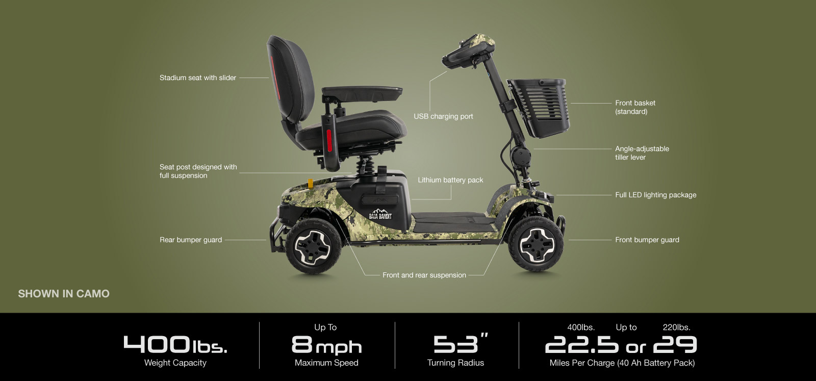 "description": "4.5\" of ground clearance to tackle uneven terrain\n \t400 lb. weight capacity\n \tCombine durability and speed and cruise up to 8 mph\n \t53\" turning radius\n \tInfinite tiller adjustment lever\n \tConvenient USB port for charging your devices\n \tFull LED lighting package for maximum visibility\n \tFull bumper package (standard)\n \tSupplemental hand brake for additional stopping power.\n \tFeather-touch disassembly\n \tSeat post designed with full suspension for comfort and stability\n \tThe upgradable dual lithium-ion battery configuration will deliver up to a 29-mile range on a single charge. (14.5 miles with the standard single lithium-ion battery)\n \t3-year warranty on lithium-ion battery\n \tColor options include Sage and Tan\n\n\n\n\n\n\n\n\n\n\n\n\n\n\n\n\n\n\n\n\n\n\n\n\n\n\nColour\nCamo,\u00a0Sage,\u00a0Tan\n\n\nWheels\n4-Wheel\n\n\nTop Speed (KM)\n12.8 km/h\n\n\nPer Charge Range (KM)\nUp to 23.3 km/h at 220 lbs.\n\n\nSuspension\nFront & Rear\n\n\nSeat Size\n18\" x 17\"\n\n\nGround Clearance\n1.5\" at motor\n\n\nOverall Width\n27.83\"\n\n\nBattery Pack\n20 Ah,\u00a040 Ah\n\n\nSeat Elevator\nNo\n\n\nTires\nPnuematic\n\n\nSpeed (KM)\n10 \u2013 15 km/h",