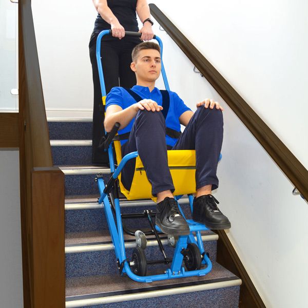 "description": "Adjustable patient head restraintLimits movement, securing the passenger in place\n \tFriction tracks (Evac+Track technology)The self braking reinforced tracks control speed of descent for easy single person operation\n \tErgonomic adjustable handleFor ease of deployment and compact storage\n \tPassenger armrests\nFor added passenger comfort and safety\n\n \t4 Point quick release safety harnessFor increased passenger safety and security\n \tHeavy duty wheelsIdeal for operation over uneven terrain\n \tLockable rear wheelsCan be applied in situations where the chair\nneeds to remain in a stationary position\n \tPassenger footrest\nAllows for stable passenger seating position\u00a0during stairway operation\n\n \tDual position adjustable seat\nAdjustable seat allows the passenger to choose\u00a0desired seating position\n\n\n\nFOLDED DIMENSIONS\n\n\n\nHeight\u00a041 inches\n\n\n\nWidth\u00a020 inches\n\n\n\nDepth\u00a08 inches\n\n\n\nWeight\u00a033lbs\n\n\n\nWeight Capacity\u00a0 440lbs",