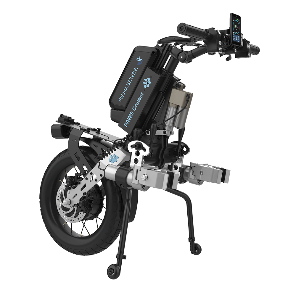 "description": "Key Facts\n\n \tWhether it is around town or along a forest trail, this model is for you. The big 16\u201d drive wheel eats up the bumps for a really smooth ride.\n \tDoes not need any frame alteration or additional add-ons to your wheelchair\n \tA standard 48V11.2Ah lithium-ion battery delivers 556 watts\n \tPAWS has an IP54 waterproof rating and can withstand rain and moisture\n \tThe range of adjustment in the clamping system allows a wide range of folding and rigid frame chairs to be fitted.\n \tAutomatic clamping & lifting or Manual clamping & lifting\n \tStandard or Tetra handles\n \tTrack assistance: self-centering tracking\n \tOptional: Special tetra handles with braking brake, full control without exertions\n \tA durable packing carton and inserts is provided to protect the PAWS from damage during transport.\n \tTools: A full set of adjusting provided with each PAWS",